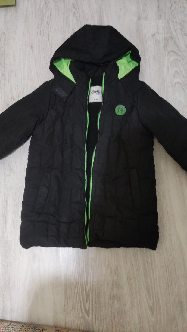 Siyah, kapüşonlu ve fermuarlı bu erkek çocuk montu, notched lapel yakaya sahip. İç kısmı canlı yeşil renkte ve hafif yumuşak kumaştan üretilmiş.Çok sıcak tutuyor