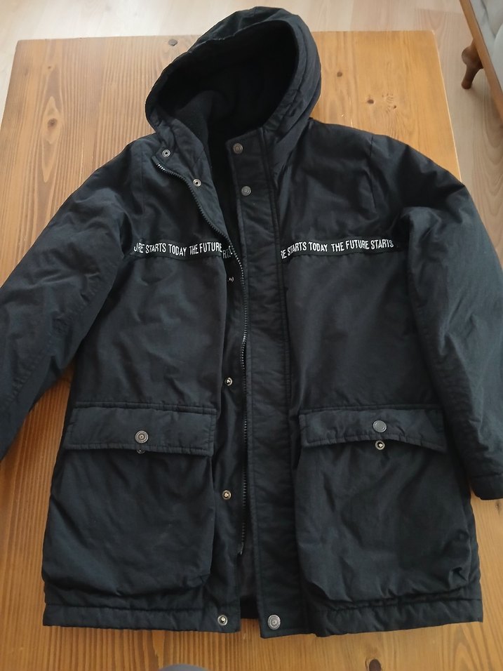 Siyah, kapüşonlu erkek çocuk kabanı, rahat kesim ve düğmeli ön kapamalı. Yumuşak ve sıcak kumaştan, göğüste baskılı detaylı, cep kapaklıdır.