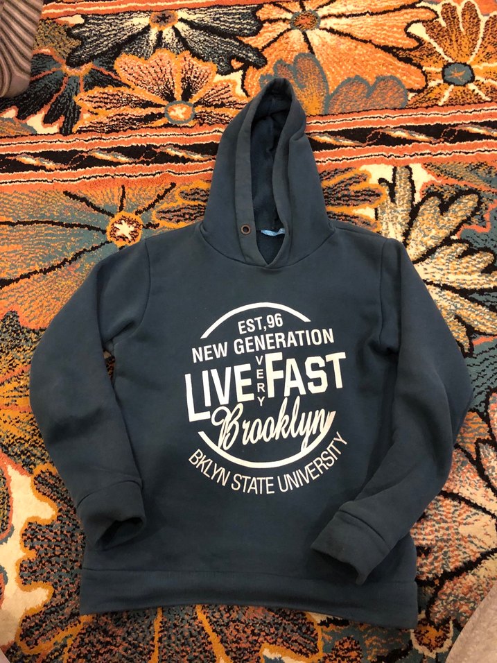 Uzun kollu, kapüşonlu siyah sweatshirt, baskılı yazılar ve kürk detaylarıyla. Rahat ve yumuşak kumaştan, günlük kullanım için uygun.