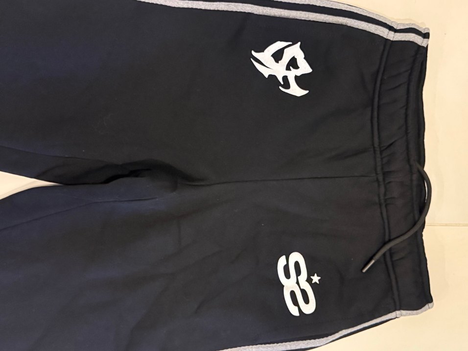 Siyah kapüşonlu, baskılı desenli ve fermuarlı detaylara sahip erkek eşofman altı. Sentetik kumaştan, bol kesim ve rahat sokak tarzı için uygun.