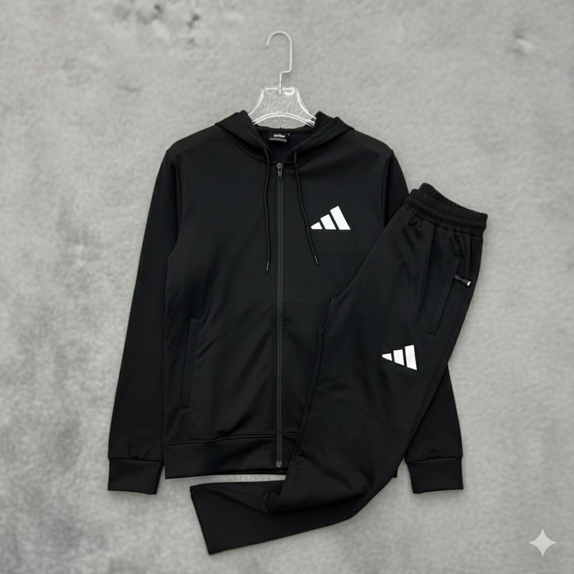 Siyah kapüşonlu, fermuarlı ceket ve uyumlu pantolondan oluşan erkek şofman takımıdır. Sentetik kumaştan, rahat kesim ve uzun kolludur. l ve xl mevcut