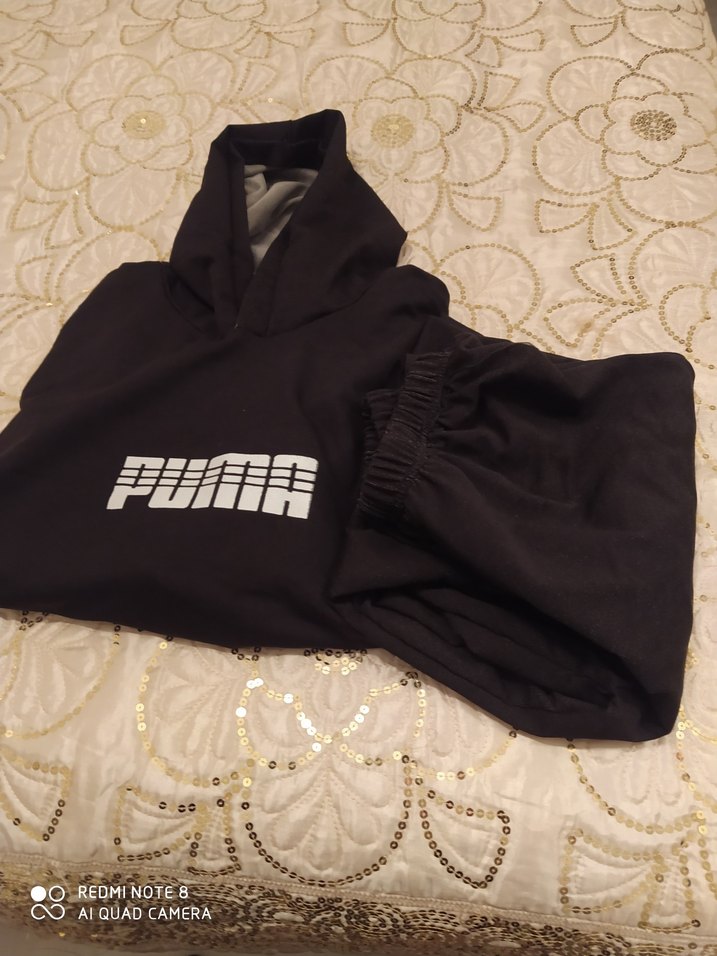 Siyah renkli, kapüşonlu ve baskılı Puma logolu erkek eşofman takımı, yumuşak ve rahat kumaştan üretilmiştir. Alt kısmı lastikli ve fermuarlı ceplidir.