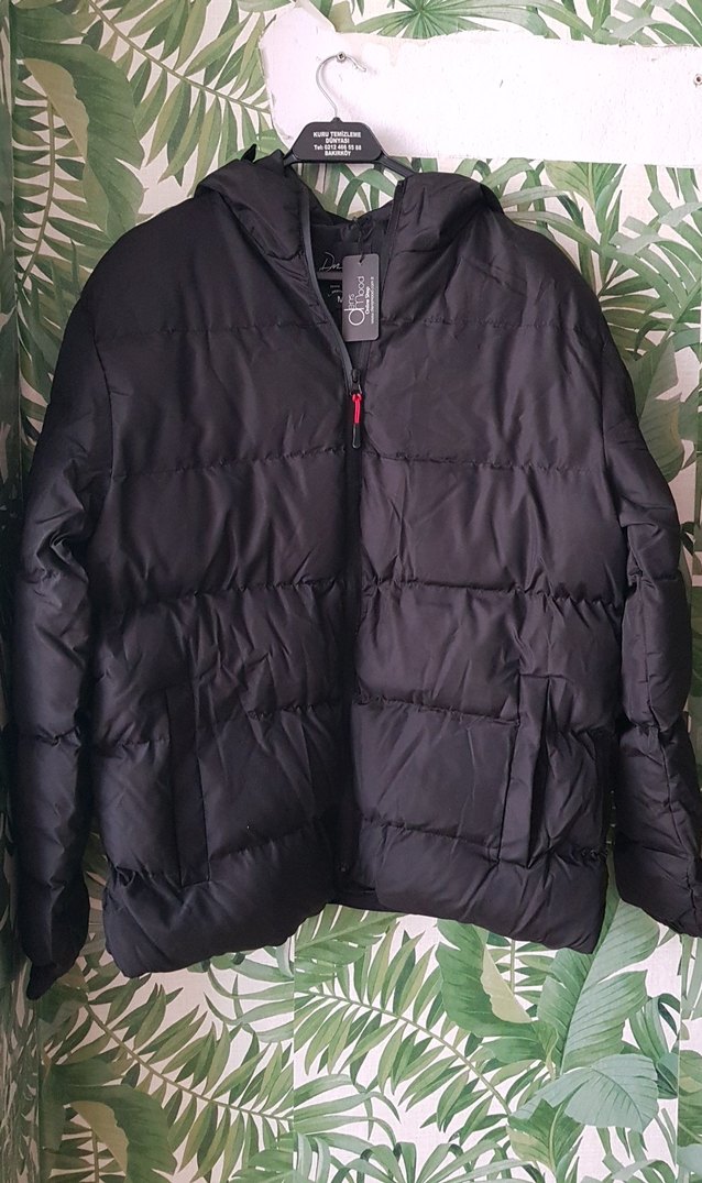 Siyah renkli, sentetik kumaştan yapılmış, fermuarlı ve bol kesim erkek kışlık mont. Uzun kollu ve kapşonlu , etiketli mont koltuk altı ölçüsü 58 cm boyu 69 cm yağmura ve rüzgara dayanikli