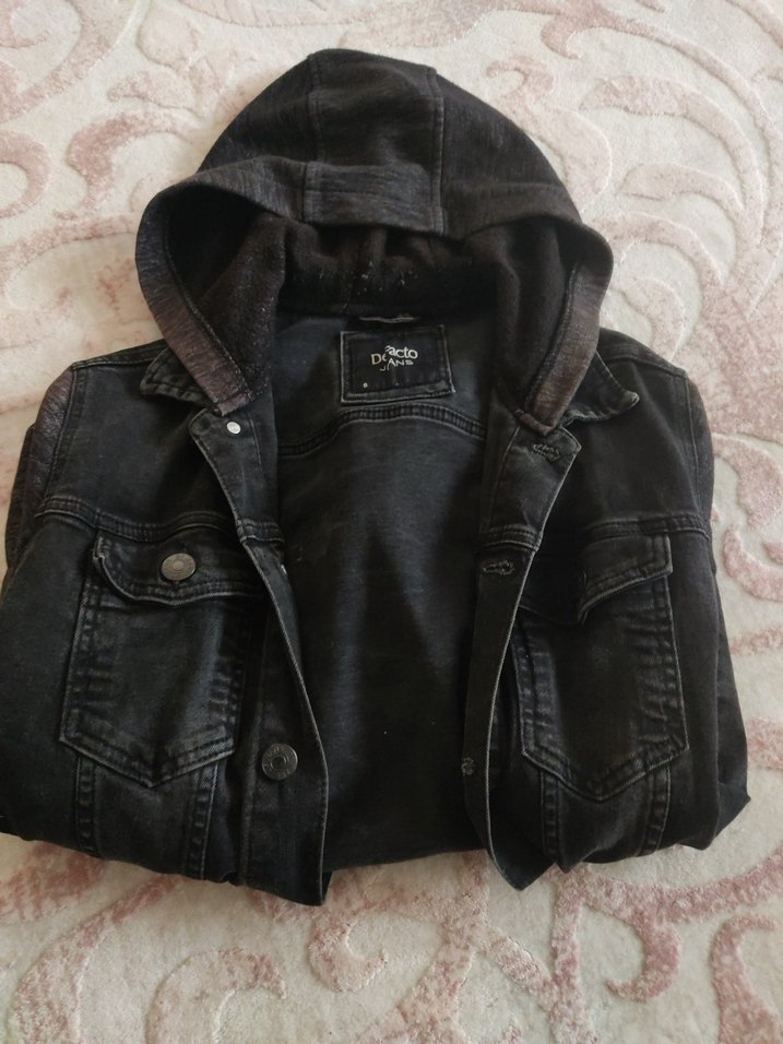 Siyah kot kumaştan, kapüşonlu ve düğmeli, bol kesim uzun kollu erkek ceket. Notch yaka detaylı, günlük kullanıma uygun. kollarında hafif renk değişimi var.belli olmayacak şekilde görseldeki gibi.ve kol ağizindada ufak bir hasarı fiyatı yansitilmistir