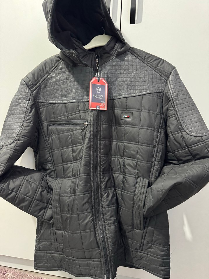 Siyah renkte, sentetik kumaştan yapılmış, kapüşonlu ve fermuarlı erkek mont. Uzun kollu, normal boyda,