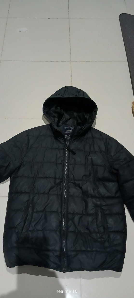 Fermuarlı kapüşonlu, siyah mont. Mavi marka mont.. Sol kolunda ufak deforme vardır son fotoğrafta ekli