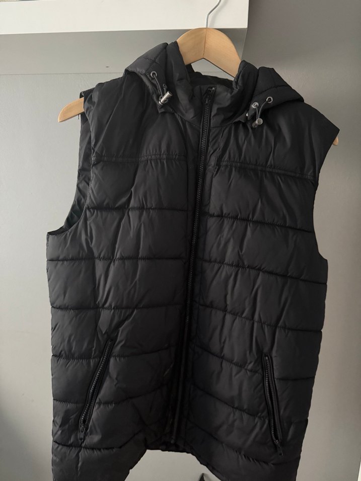 Siyah, kapüşonlu ve fermuarlı ön ceplere sahip, yüksek yakalı, kolsuz şişme yelek. Sıcak ve yumuşak kumaştan, günlük kullanıma uygun, kapşonlusu çıkarılabilir