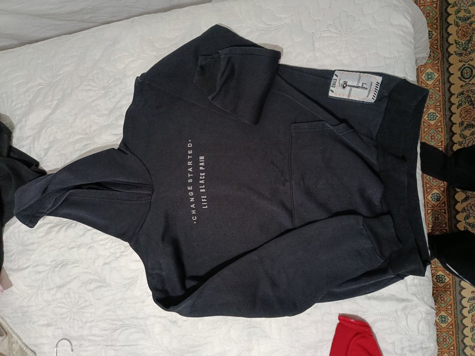 Siyah kapüşonlu, uzun kollu ve bol kesim erkek sweatshirt. Yumuşak ve sıcak kumaştan üretilmiş, önünde "CHANGE STARTED" yazısı bulunur. ürün A kalite temiz bi sorunu yoktur M beden salaş kesim