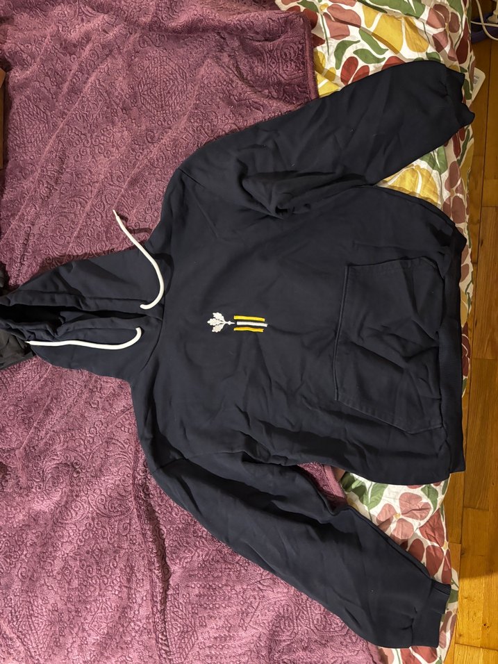 Siyah kapüşonlu, uzun kollu ve bol kesim kadın sweatshirtü, önünde fermuarlı cep ve yumuşak kumaş bulunur, rahat kullanım için uygundur.