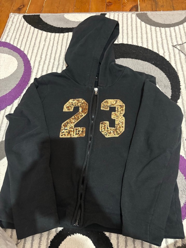 siyah kapüşonlu, fermuarlı ve baskılı '23' detaylı, yumuşak ve sıcak kumaştan yapılmış dar kesim ceket.