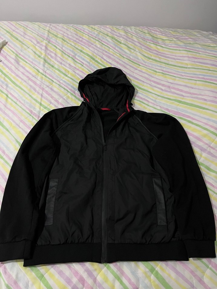 Bu siyah kapüşonlu ceket, sentetik kumaştan yapılmış, fermuarlı ve tam kolludur. Dış mekan kullanımı için uygundur.
