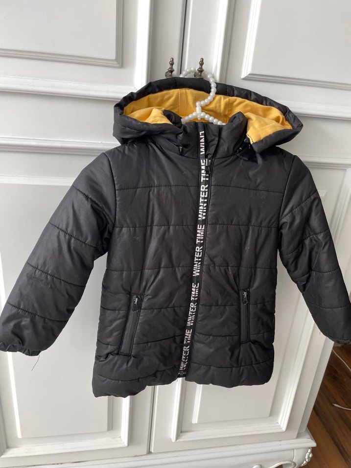 Sarı astarlı kapüşonlu, fermuarlı ve cep detaylı siyah erkek çocuk mont. İnce kesim, sıcak tutan kumaştan, sokak stiline uygun.