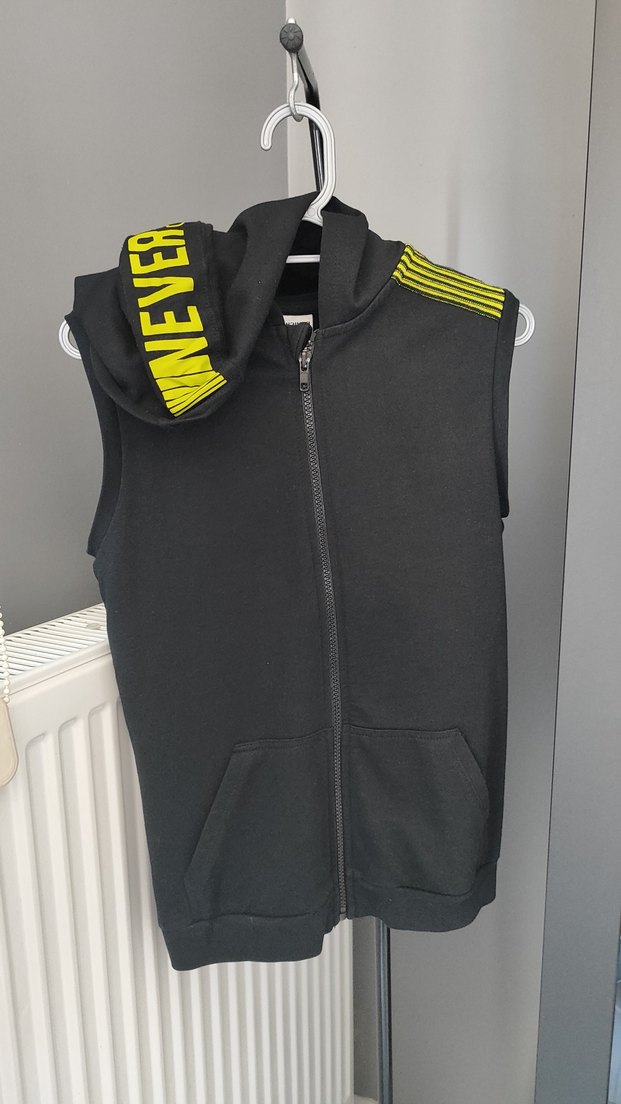 Yüksek yakalı, fermuarlı siyah erkek yelek. Kapüşon ve omuzda sarı baskılı detaylar bulunur. Sokak modasına uygun, yumuşak ve sıcak kumaştan.