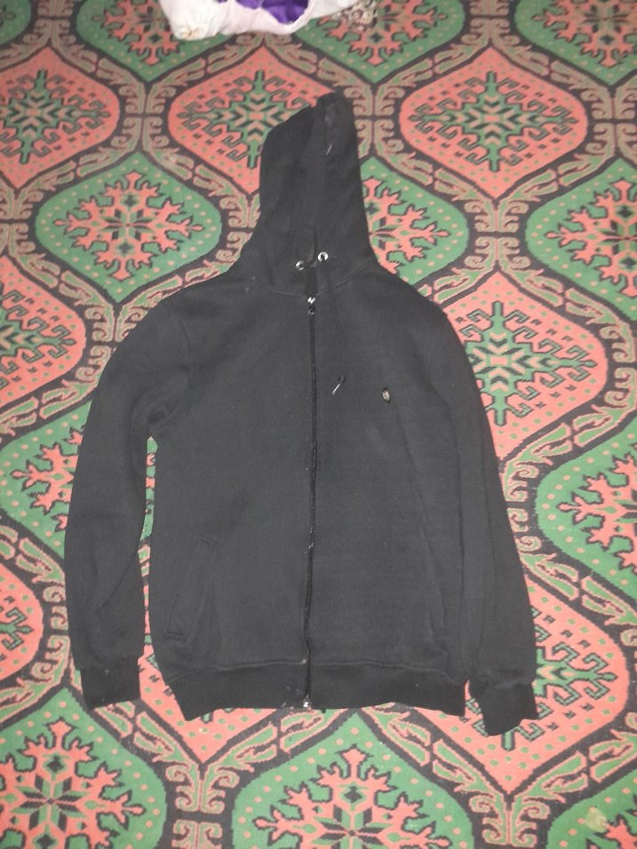Siyah kapüşonlu ve fermuarlı, uzun kollu, yumuşak kumaştan erkek hırka