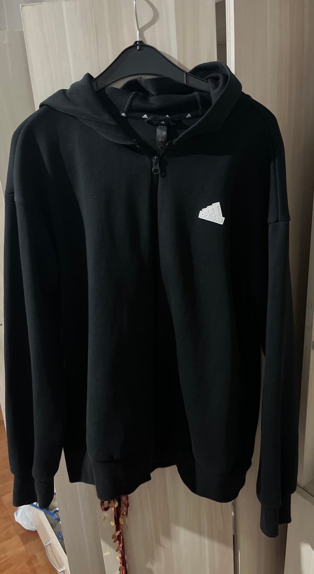 Uzun kollu, fermuarlı, kapüşonlu siyah sweatshirt, bol kesim ve yumuşak fleece kumaşlıdır. Günlük sokak stili için uygundur.