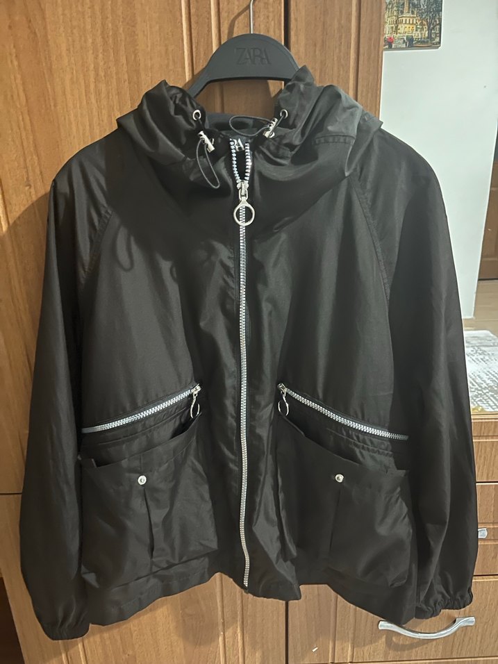Siyah renkte, fermuarlı, kapüşonlu ve çıtçıtlı ceplere sahip, sentetik kumaştan midi uzunlukta bol kesim kadın ceketi.