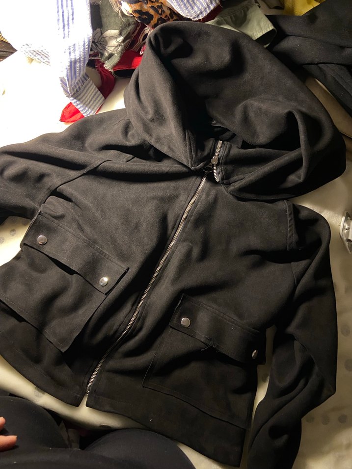 Siyah kapüşonlu, fermuarlı, uzun kollu kadın ceket. Önünde çıtçıtlı cepler bulunur, rahat ve sıcak kumaştan üretilmiştir.