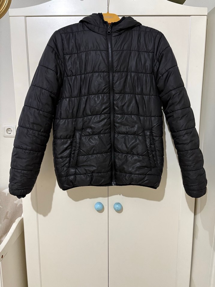 Siyah, fermuarlı ve kapüşonlu kadın ceketi. Uzun kollu, sentetik kumaştan ve rahat kesimli, günlük kullanım için uygun.