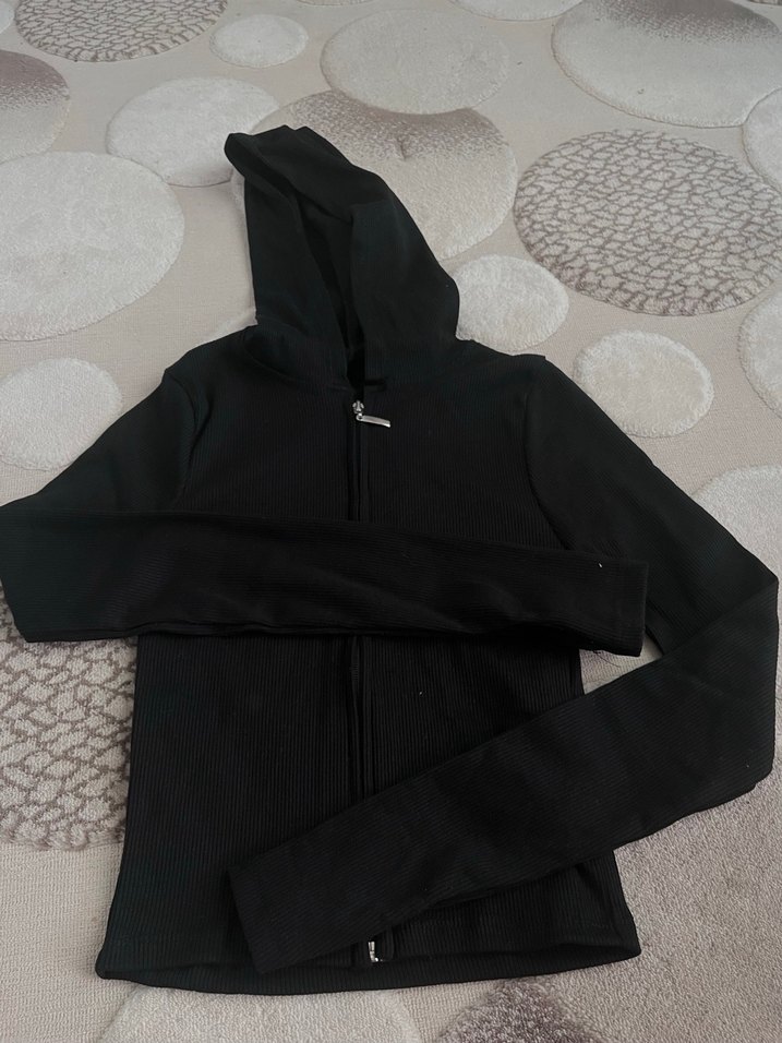 Siyah renkli, kapüşonlu ve fermuarlı kadın ceketi, uzun kollu ve vücuda oturan kesime sahiptir. Orta boy uzunlukta, yumuşak ve sıcak kumaştan üretilmiştir. Kaskorse olup kalıp harika dir