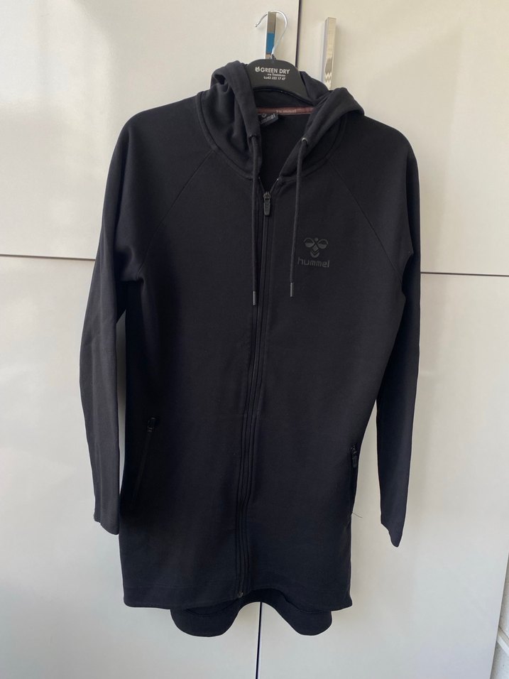 Siyah, kapüşonlu ve fermuarlı bu kadın spor ceketi, uzun kollu ve midi boydadır. Yumuşak kumaştan üretilmiş olup, günlük rahat bir tarzdadır. Hummel marka m beden ve yeniden farksızdır. Arkası önden daha uzundur.