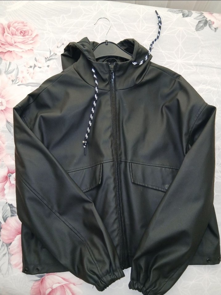 Yüksek yakalı, fermuarlı ve bol kesim siyah kadın ceketi. Sentetik kumaştan üretilmiş, midi boyda ve sokak stiline uygun. Hicbir defosu yoktur, en fazla 2 kere giyildi
