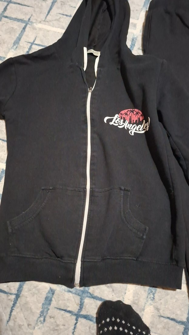 Fermuarlı, kapüşonlu ve uzun kollu siyah kadın ceketi, 'Los Angeles' baskılıdır. Yumuşak ve sıcak kumaştan, günlük sokak stili için uygundur. kullanılmıs iyi durumda