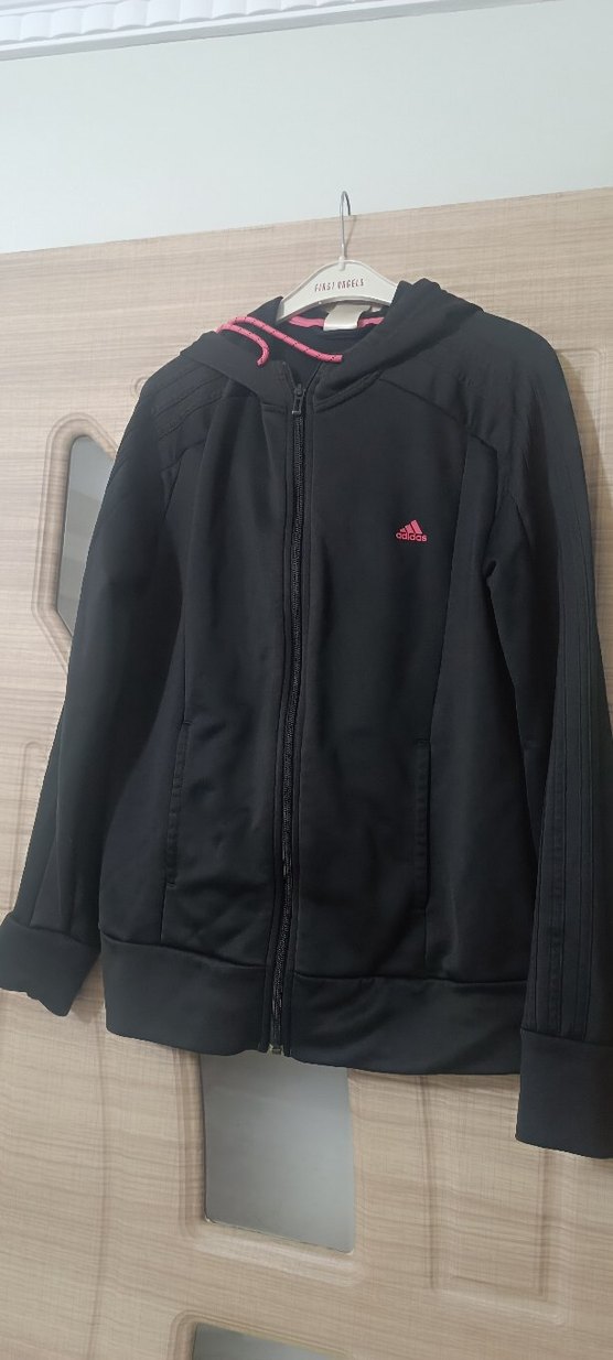 Siyah kapüşonlu, fermuarlı kadın ceketi, uzun kollu ve vücuda oturan kesime sahip. Yumuşak ve sıcak dokulu malzeme kullanılmış, göğüste küçük pembe Adidas logosu bulunur.