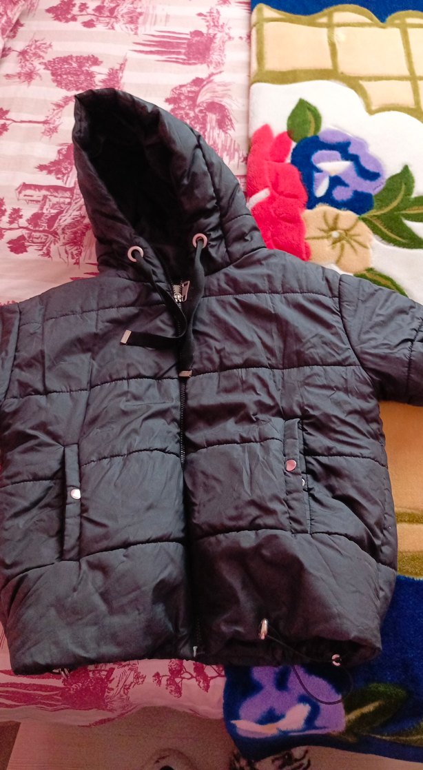 Siyah renkli, kapüşonlu ve fermuarlı kısa boy kadın kışlık mont. Uzun kollu ve dar kesim, rahat ve sıcak kumaştan üretilmiştir.