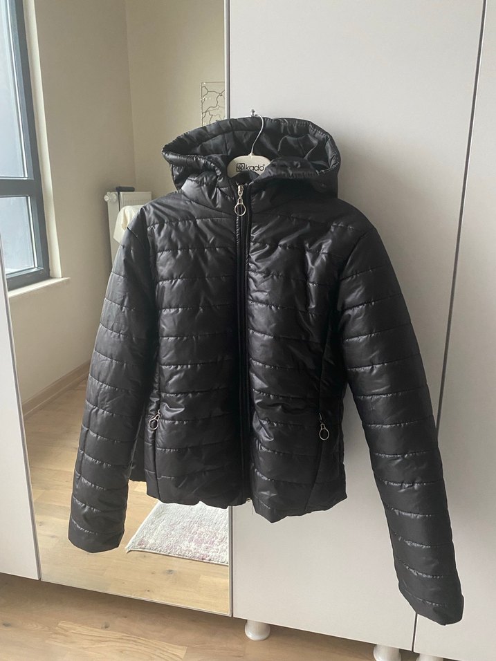 Siyah, kapüşonlu ve fermuarlı, normal midi boyda, dar kesim kadın kışlık mont. Rahat ve sıcak sentetik kumaştan, günlük sokak stili için uygun. Sıfır şişme mont bir kere bile giyilmedi hediye geldi S-M beden uyumlu L ye de olabilir marka temsilidir