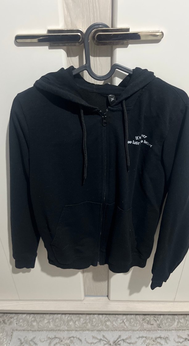 Yumuşak ve sıcak kumaştan, uzun kollu siyah kapüşonlu fermuarlı sweatshirt. Dar kesim ve günlük rahat kullanım için uygundur.