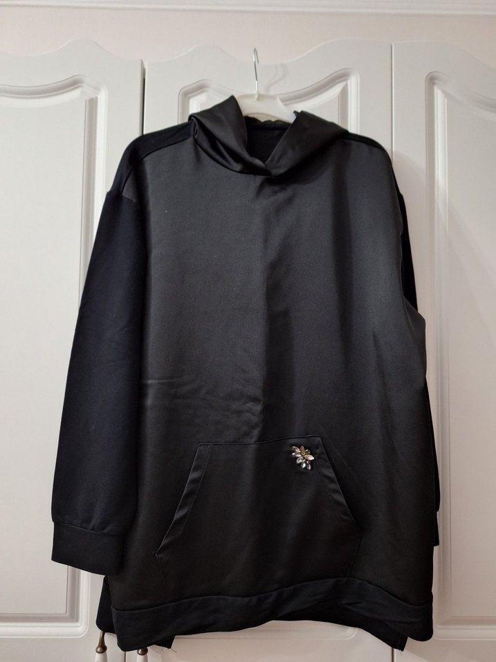Siyah kapüşonlu, uzun kollu ve fermuarlı rahat kesim sweatshirt. Yumuşak ve sıcak kumaştan, günlük sokak stiline uygundur.