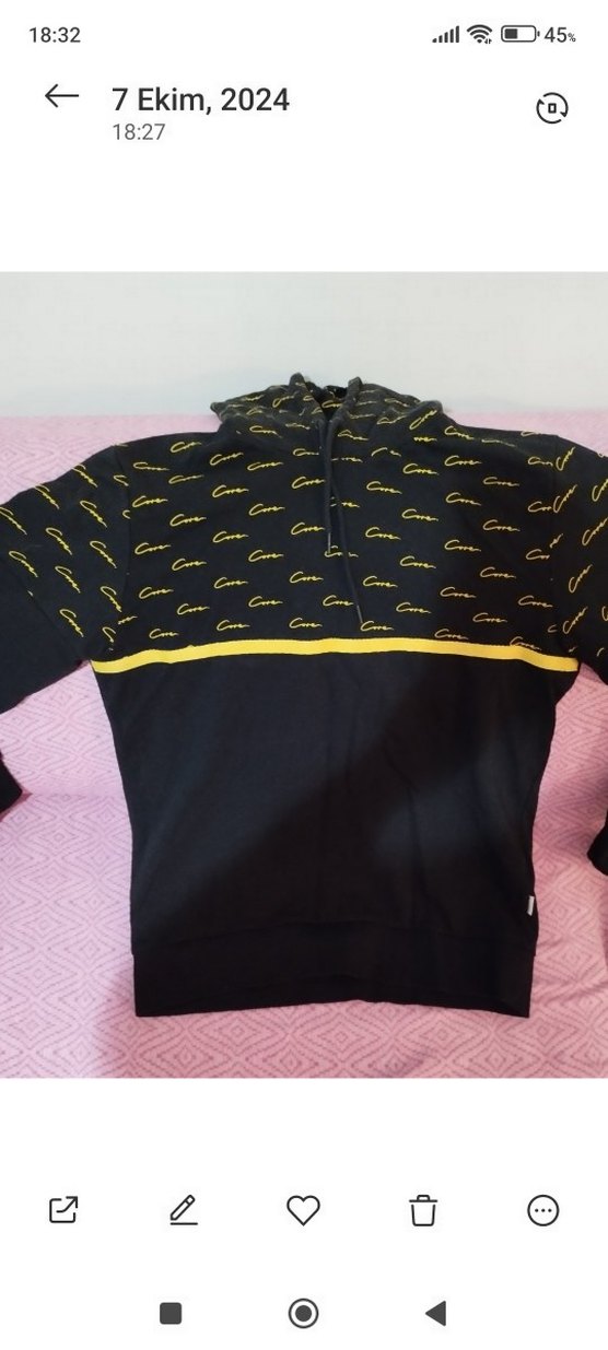 Siyah, kapüşonlu ve fermuarlı kadın sweatshirt. Uzun kollu, baskılı desenli ve sarı şerit detaylı. Yumuşak ve sıcak kumaştan günlük kullanım için uygundur. bir kere giyildi