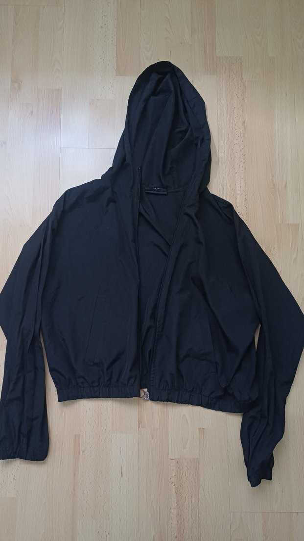 Siyah renkli, yüksek yakalı ve uzun kollu kadın ceketi, fermuarlı ve bol kesimdir. Croptur. Sentetik kumaştan yapılmıştır, günlük sokak tarzına uygundur.