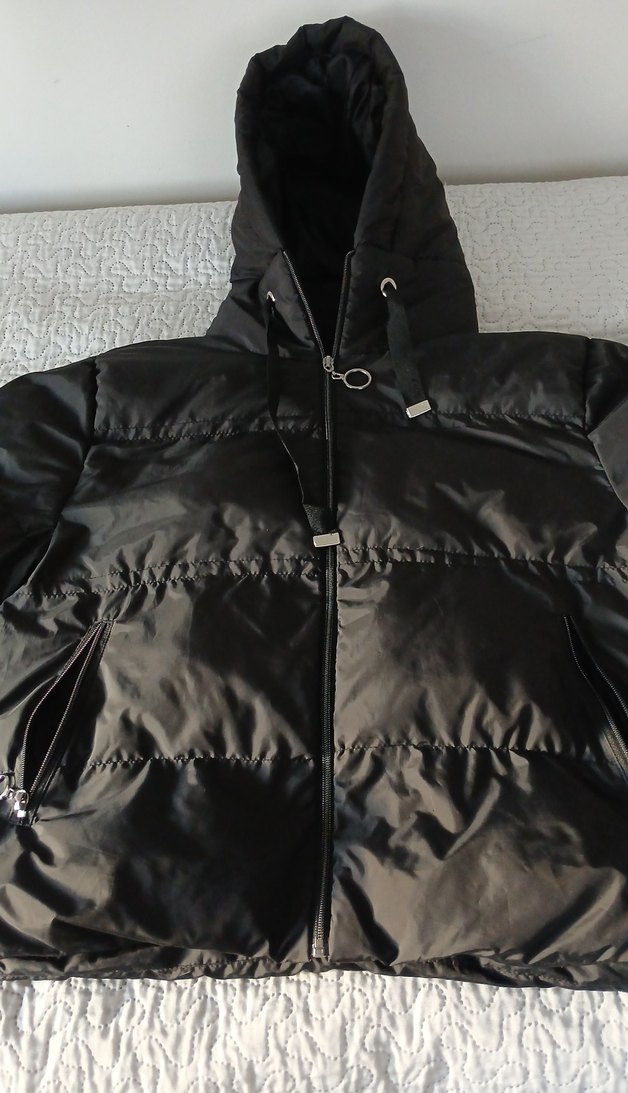 Siyah renkli, fermuarlı ve strappy kollu, normal midi boyda, yumuşak ve sıcak kumaştan yapılmış, fit kesim bir kışlık mont.Notch yaka detayıyla sokak stiline uygun. 44 beden ama ben 165 boy 50 kiloyla giydim oversize duruyo.Tamamen sorunsuz çok az giyildi.