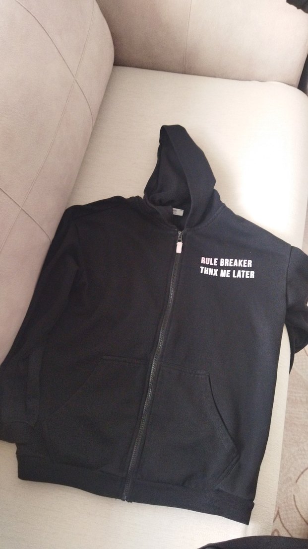 Siyah kapüşonlu, fermuarlı ve 'RULE BREAKER, THAX ME LATER' baskılı yumuşak kumaş kiz sweatshirt. Bol kesim, uzun kollu, günlük kullanıma uygun.