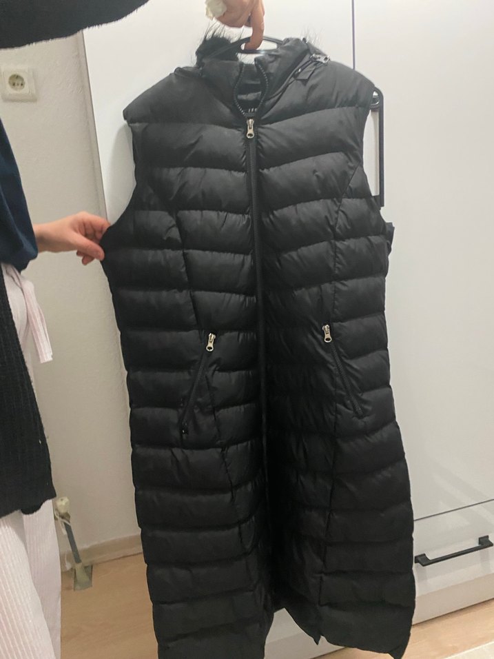 Siyah Kapüşonlu Fermuarlı Midi Kadın Yelek