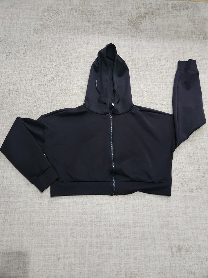 Siyah renkli, kapüşonlu ve fermuarlı kısa kesim sweatshirt. Uzun kollu ve bol kesim