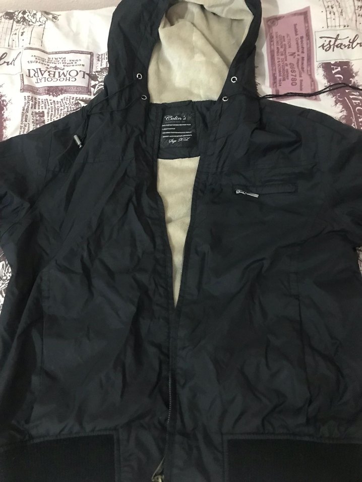 Siyah, kapüşonlu ve fermuarlı mont. Yüksek yakalı, dar kesim ve sentetik kumaştan, günlük ve sokak stiline uygun.