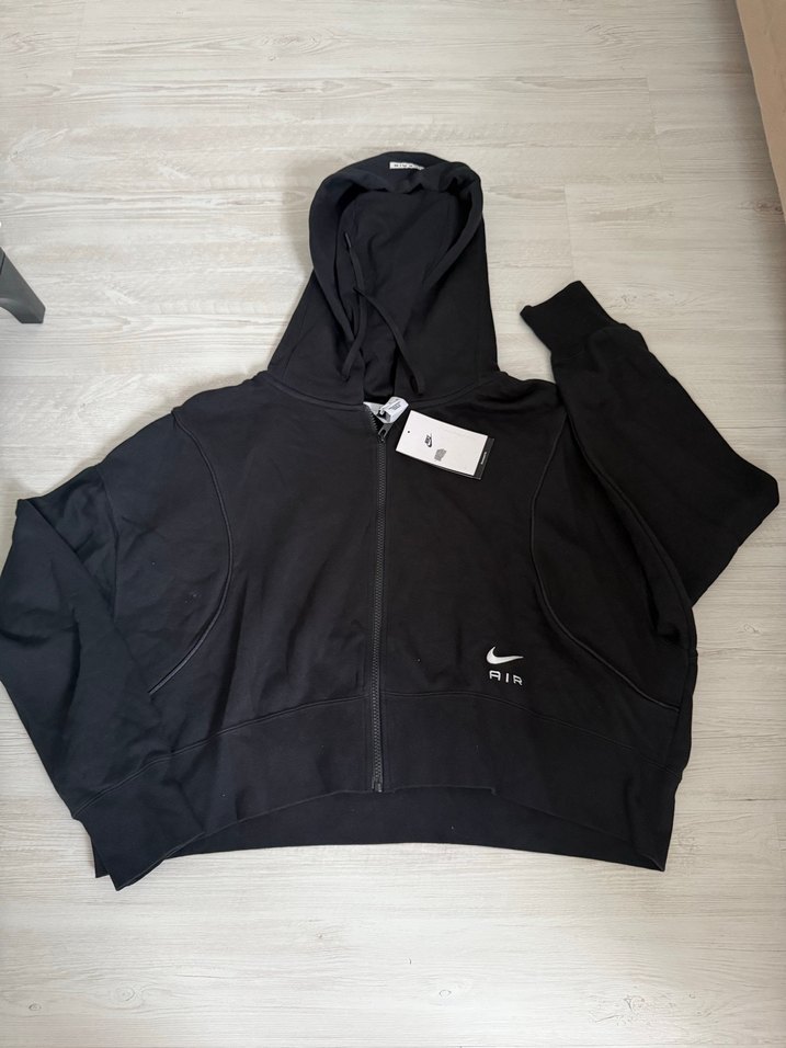 Bu siyah kapüşonlu sweatshirt, fermuarlı önü ve bol kesimiyle rahat bir kullanım sunar. Uzun kollu, yuvarlak yakalı ve küçük logo detayı bulunur.