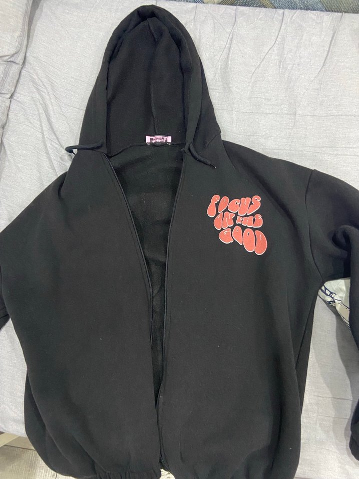 Yumuşak kumaştan, fermuarlı ve kapüşonlu siyah sweatshirt. Bol kesim, uzun kollu ve baskılı detaylara sahip, rahat kullanım için uygundur. M-L beden, bi kusuru yoktur, 4-5 defa giyildi tekliflere açığım