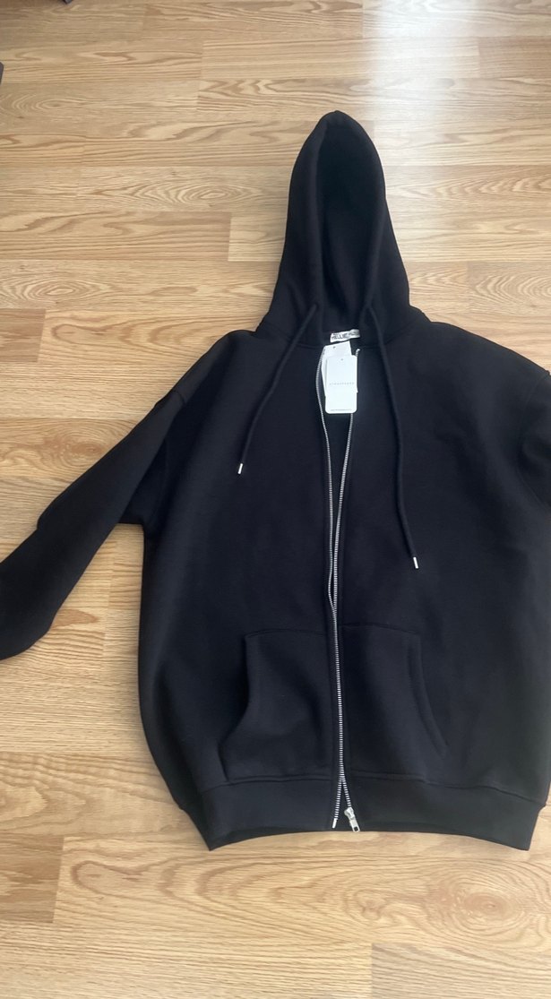 Siyah kapüşonlu sweatshirt, fermuarlı ön ve uzun kollu, yumuşak ve kalın kumaştan, rahat bir kesime sahiptir.