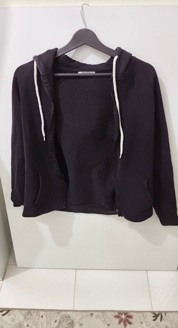 Bu siyah sweatshirt, bol kesim ve uzun kolludur, yumuşak ve sıcak kumaştan üretilmiştir. Yuvarlak yakalı, fermuarlı ve ön ceplidir, günlük kullanım için uygundur.