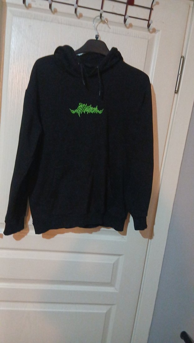Siyah kapüşonlu, fermuarlı, uzun kollu, bol kesim sweatshirt. Rock punk tarzını yansıtan sokak modası esintili, sentetik kumaştan üretilmiştir.