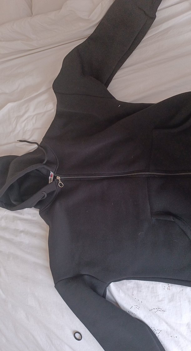 Siyah renkli, kapüşonlu ve fermuarlı sweatshirt. İnce kesimi, uzun kollu ve normal boyda, athleisure tarzına uygun.