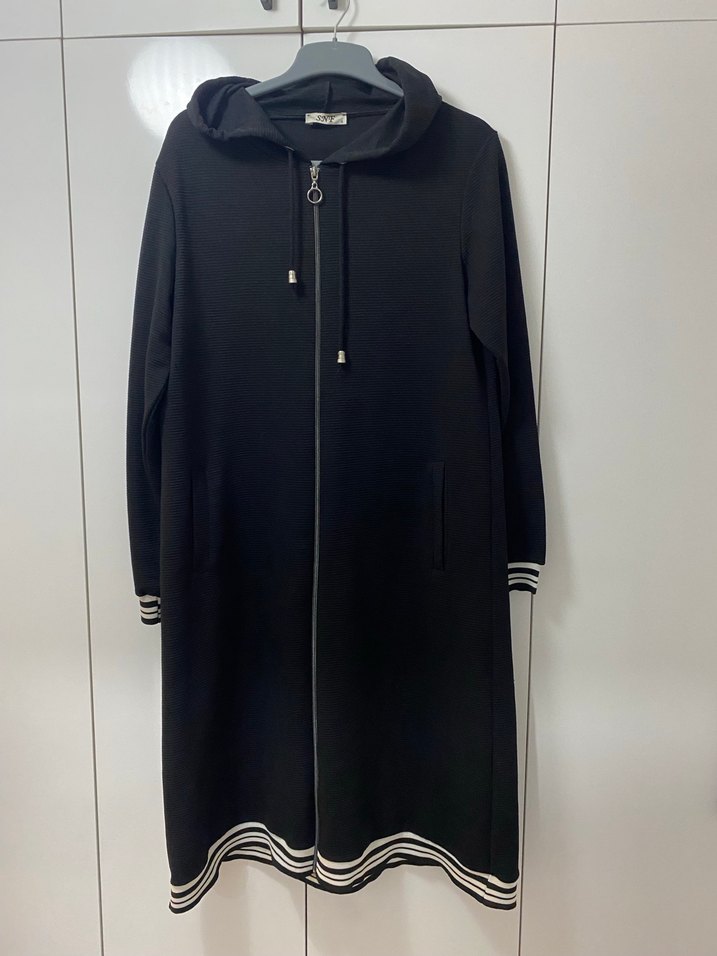 Siyah Kapüşonlu Fermuarlı Uzun Kadın Kap