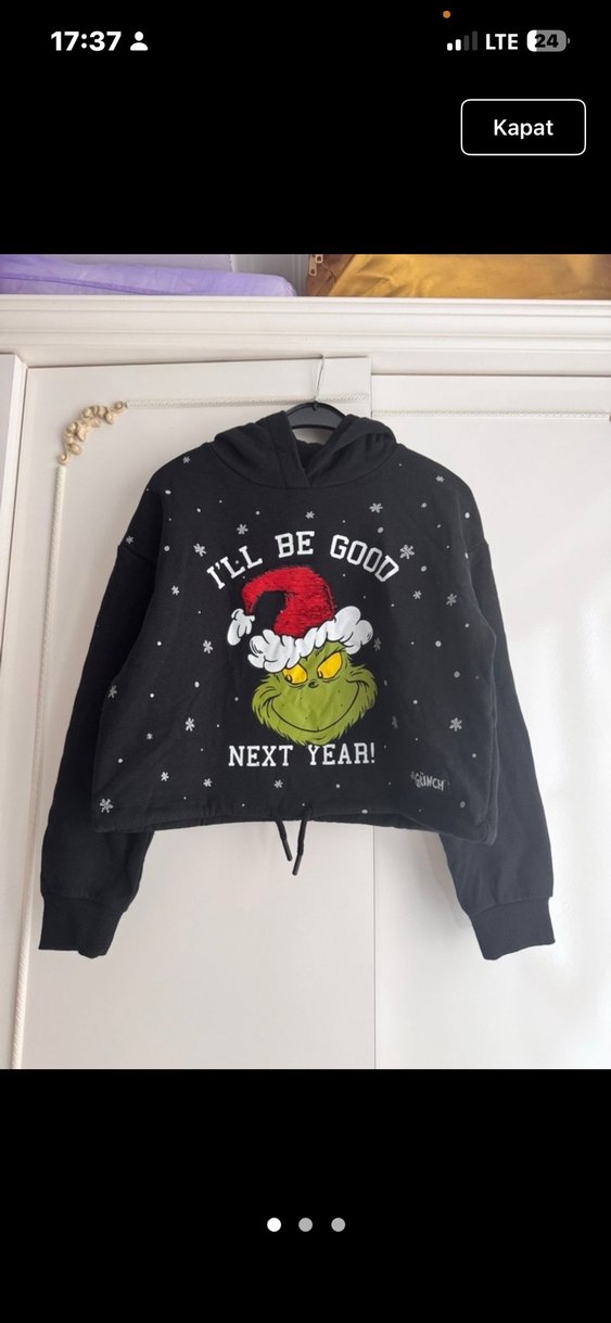 Siyah kapüşonlu sweatshirt, uzun kollu ve gevşek kesimdir. Örgü detaylı, yumuşak ve sıcak kumaştan yapılmıştır. Üzerinde Noel temalı baskı bulunmaktadır.