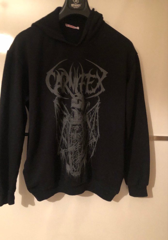 Uzun kollu, kapüşonlu, siyah goth sweatshirt. Gevşek kesim, fermuarlı ve baskılı tasarıma sahip, sentetik kumaş kullanılmış. İki kol aradı 62 cm boy 63cm