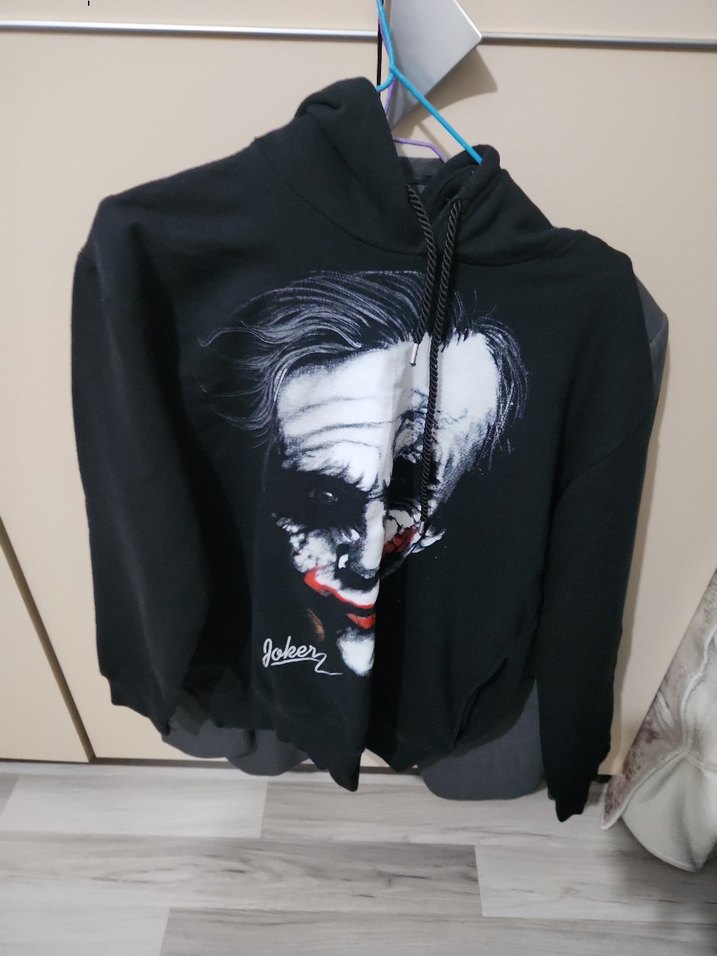 Siyah kapüşonlu, Joker yüz baskılı, fermuarlı uzun kollu sweatshirt. Yumuşak ve sıcak kumaştan, rahat kesim.