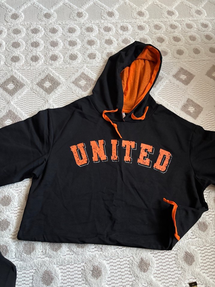 Siyah, turuncu astarlı kapüşon ve bağcık detaylı, bol kesim, uzun kollu kadın sweatshirt. Önünde "UNITED" baskısı bulunur.