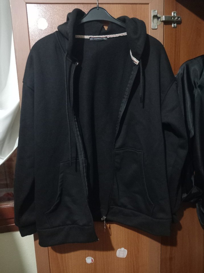 Siyah kapüşonlu, fermuarlı, bol kesim ve uzun kollu kadın ceketi, yumuşak ve sıcak kumaştan, günlük kullanıma uygun.